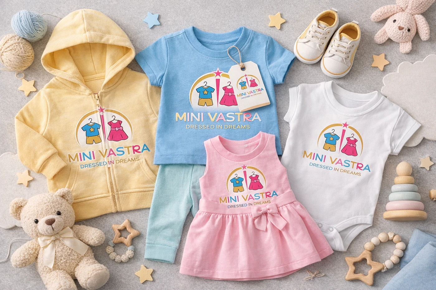 The Mini Vastra logo was thoughtfully designed by Mizzeo Digital to represent innocence, imagination, and the joy of childhood fashion. The logo features playful clothing icons symbolising boys’ and girls’ wear, reflecting inclusivity and variety in kids clothing. Soft, pastel-inspired colors convey comfort, warmth, and gentleness—key emotions associated with children and parents alike. The circular form represents care, protection, and completeness, while the clean and friendly typography ensures the brand feels modern, trustworthy, and premium. Overall, the logo communicates a dreamy, cheerful, and nurturing brand identity that aligns perfectly with kids wear, making it suitable for apparel labels, retail stores, packaging, and digital platforms.